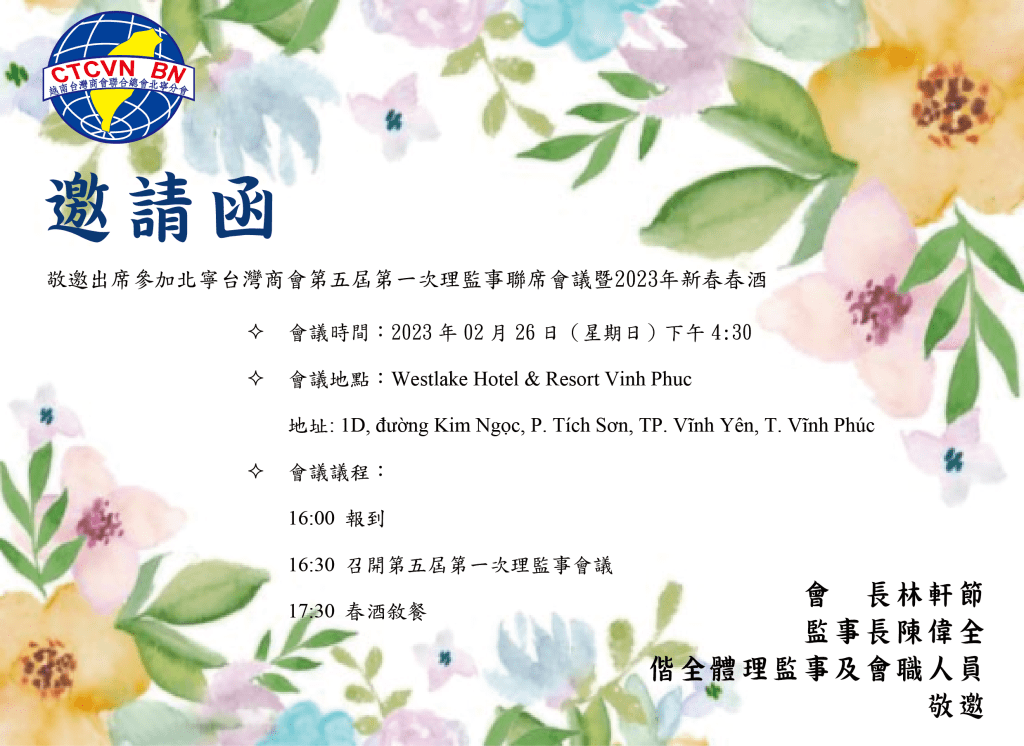 本會謹訂於2023年02月26日(日)下午16:30假永福省Westlake Hotel & Resort Vinh Phuc舉辦【第五屆第一次理監事聯席會議及2023年新春春酒】(詳細如附件),敬請各位會員踴躍報名參加。