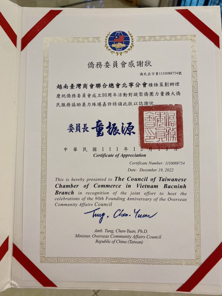 林易民公使代表僑務委員會頒發感謝狀,感謝北寧商會的鼎力支持並積極策劃舉辦慶祝僑委會90週年活動。林軒節會長致詞時預祝第五屆第一次理監事圓滿成功並希望各位理監事、會員繼續支持商會活動。在這個機遇與挑戰共存的2023年,大家互相交流、分享、共同發展,共創美好未來!