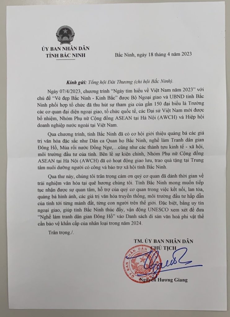 北寧省人民委員會與越南外交部在2023年4月7日聯合舉辦「2023越南文化探究體驗日」,活動吸引了近150名來自駐越外交使團和國際組織的大使與代表、河內的東協婦女團體(AWCH)及越南的外國商會,將北寧省的文化特性和遺產向國際友人介紹。北寧省委書記阮英俊致詞時強調:北寧省希望與國際社會聯繫並推廣該省的形象、文化和投資環境。同時,也建議向聯合國教科文組織提送申請將「東湖繪畫」列入需要保護的非物質文化遺產。