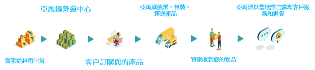 賣家銷售,亞馬遜外送。您只需將產品批量發送至亞馬遜營運中心,後續物流步驟均由亞馬遜為您完成並提供售後服務,協助您節省人力、物力和財力。若您使用FBA服務,您還可以觸及海量Prime會員、享受隔日達/隔日達外送服務、贏得「購買按鈕」、並獲得全天候專業客服。